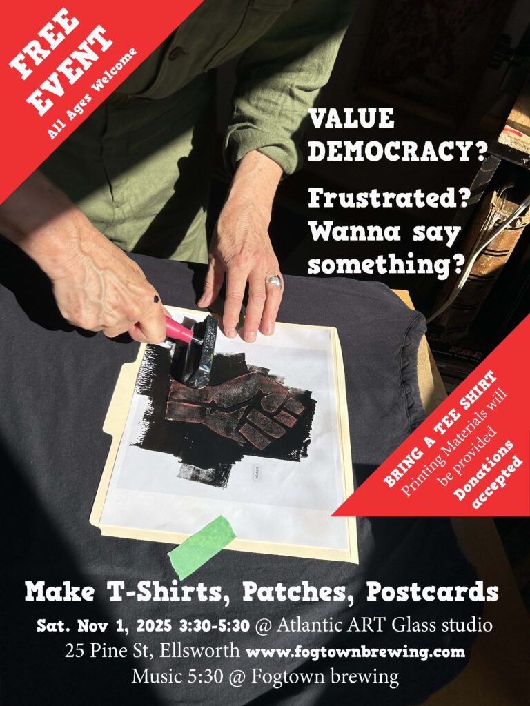 Got something to say? Are you frustrated with the status of democracy? Join us at our Tee-shirt Expression Jam Session Nov 1, 3:00-5:30 at Atlantic Art Glass Studio: 25 Pine St, in Ellsworth. Stay for music at Fogtown starting at 5:30.